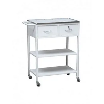 Столик для перевязочных отделений. Конструкция состоит из каркаса и закрепленных на нем с помощью дуговой электросварки элементов. Сверху установлена столешница с двойной отбортовкой (плющеньем) высотой 16 мм, под ней находятся: 2 ящика на роликовых направляющих, один из них с замком, под ящиками установлены две полки, имеется ручка для перемещения. Расстояние между полками - 266 мм, от верхней полки до ящиков - 258 мм.